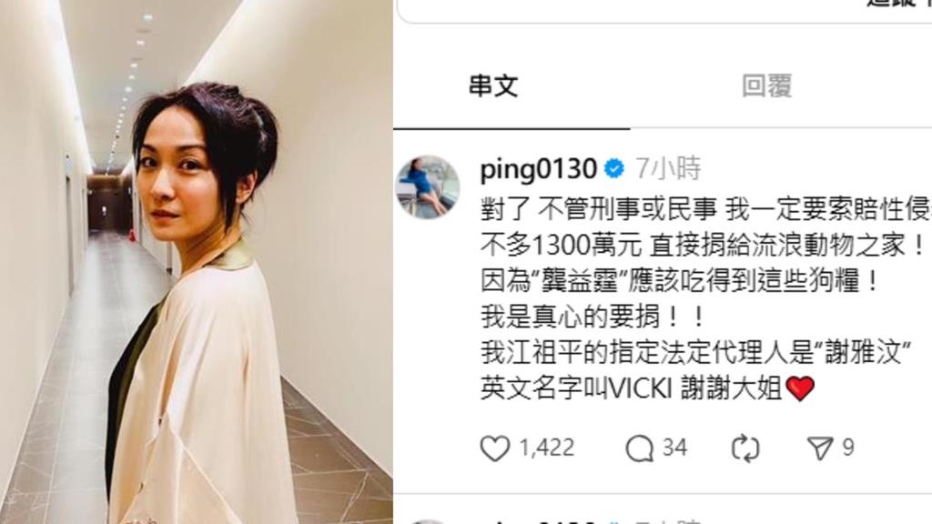 江祖平今(5)日凌晨透過Threads發文,強調「不管刑事或民事,我一定要索賠性侵罪」,並向對方索賠1300萬元,表示會直接捐給流浪動物之家,開嗆男方「因為『龔益霆』應該吃得到這些狗糧!我是真心的要捐!」;此外,牠也宣布已謝雅汶(英文名VICKI)為法定代理人。