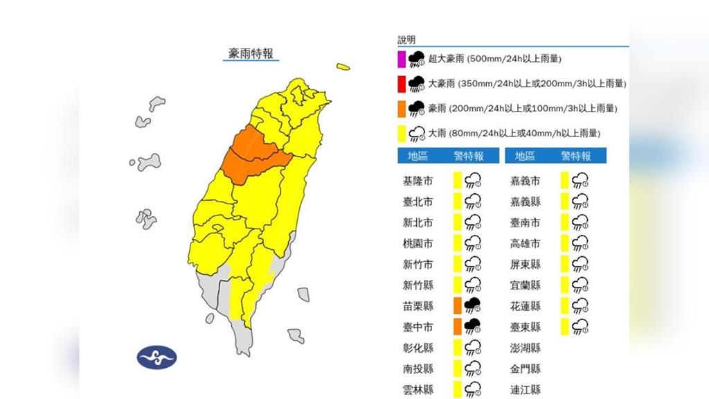最新!中央氣象署今(7)日近4時針對苗栗縣、台中市發布「豪雨特報」,至於「大雨特報」範圍則包含基隆市、台北市、新北市、桃園市、新竹市、新竹縣、彰化縣、南投縣、雲林縣、嘉義市、嘉義縣、台南市、高雄市、屏東縣、宜蘭縣、花蓮縣、台東縣。氣象署也對台中市東區、北屯區、太平區、大里區發布大雷雨即時訊息,持續時間至下午5時。