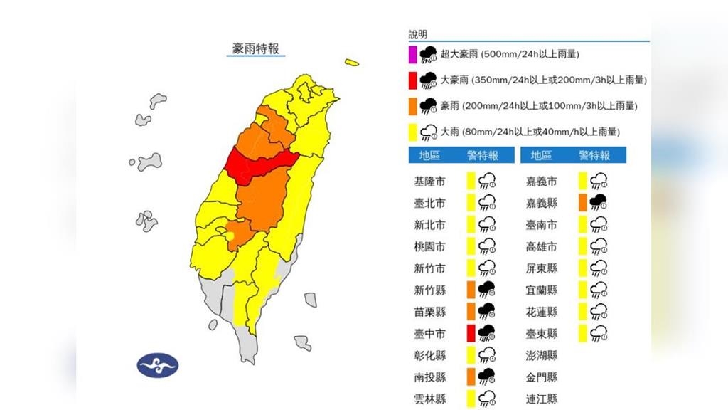 另,氣象署下午5時3分針對台中市發布「大豪雨特報」,而「豪雨特報」範圍則為新竹縣、苗栗縣、南投縣、嘉義縣,至於,基隆市、台北市、新北市、桃園市、新竹市、彰化縣、雲林縣、嘉義市、台南市、高雄市、屏東縣、宜蘭縣、花蓮縣、台東縣。