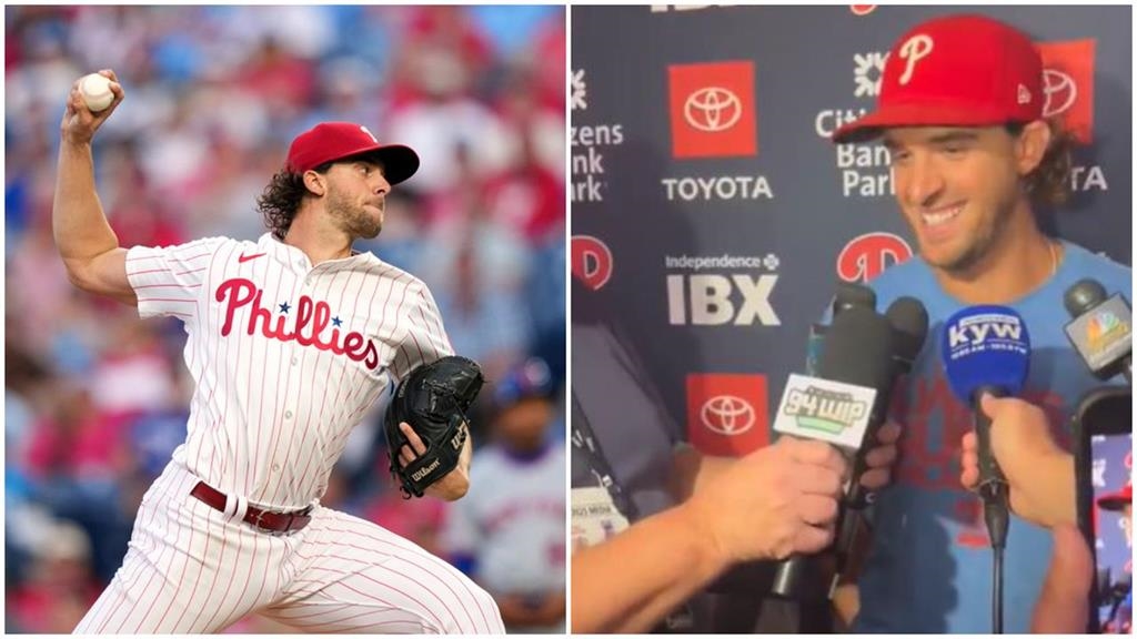 費城人投手諾拉(Aaron Nola)重拾王牌身手,在對大都會之戰繳出6局無失分的優質先發,賽後接受大批媒體採訪時卻突發尷尬插曲,引起全場爆笑。