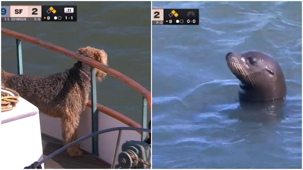 巨人在主場迎戰道奇,比賽打尾聲,轉播鏡頭突然捕捉到甲骨文球場外的麥考維灣有海豹現蹤,還與遊艇上的狗狗互動,讓這場勝負已定的比賽增添可愛畫面。
