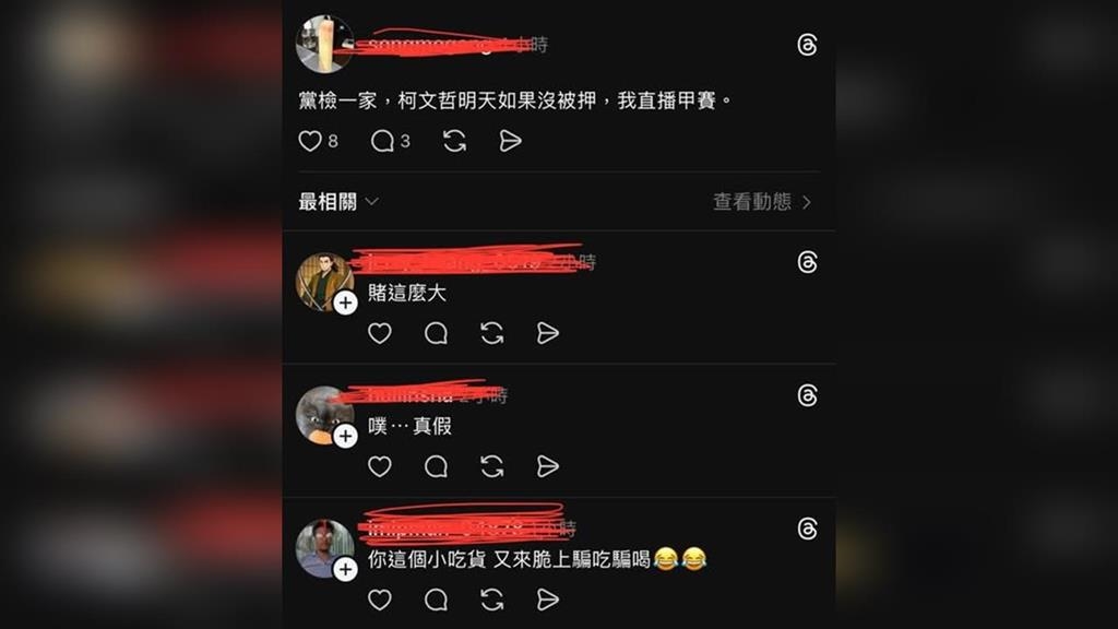 前台北市長柯文哲涉京華城案昨(15)日重開羈押庭,法院裁定維持原交保金額,柯文哲與台北市議員應曉薇順利交保。庭前社群出現一篇「祭品文」,一名網友「小草」痛批民進黨「黨檢一家」,揚言若柯文哲未被押將直播「甲賽」,在維持原裁定消息傳出後,貼文隨後也被刪除。不料,支持民眾黨的YouTube主播「DearNaNa」轉發截圖,引起大量網友留言討論。