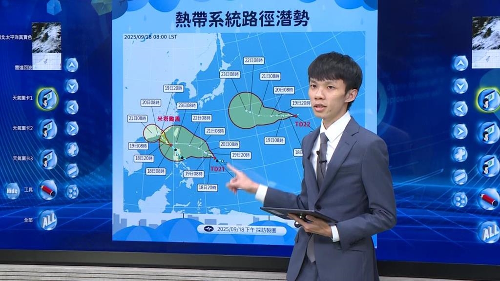中央氣象署預報員李名翔:「編號第21號的這個熱低壓,那預估其實它在今天(18)也不排除,是有機會再增強為颱風的趨勢,那預計下週一的時候,它就會開始受到外圍環流影響,台灣的天氣也會開始有一些變化,而且到時候它的強度也可能會增強到中度颱風的等級,特別是週一到週三,距離台灣相對是比較近的,也要留意它後期的一個預報資訊。」