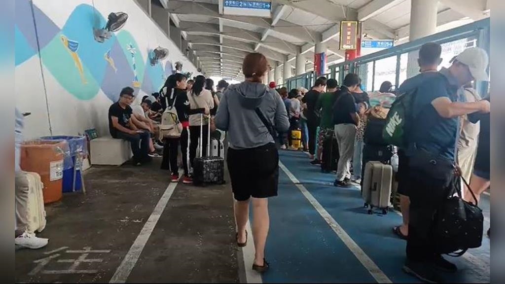 廣播聲響起,碼頭一大早迅速熱鬧起來,大批遊客拖著行李箱,像潮水般湧向登船口,準備回程。旁邊,還有一群人坐在長長的排隊人龍旁等待著,因為剩餘的航班,空位恐怕所剩無幾。終於,船隻緩緩靠岸,遊客們依序下船,回到富岡漁港,就有民眾說,自己提早回來,就是知道颱風要來了,會沒有船可搭。