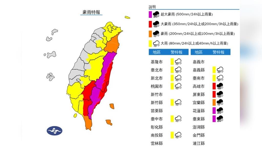 對於高雄市山區、屏東縣山區、花蓮縣、台東縣平地,氣象署也發布大豪雨特報。