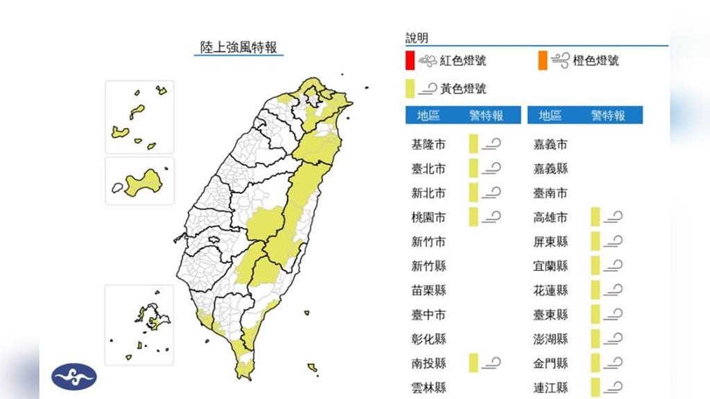 氣象署下午4時38分針對基隆市、台北市、新北市、桃園市、南投縣、高雄市、屏東縣、台東縣、花蓮縣、宜蘭縣、澎湖縣、金門縣、連江縣發布黃色燈號的陸上強風特報。