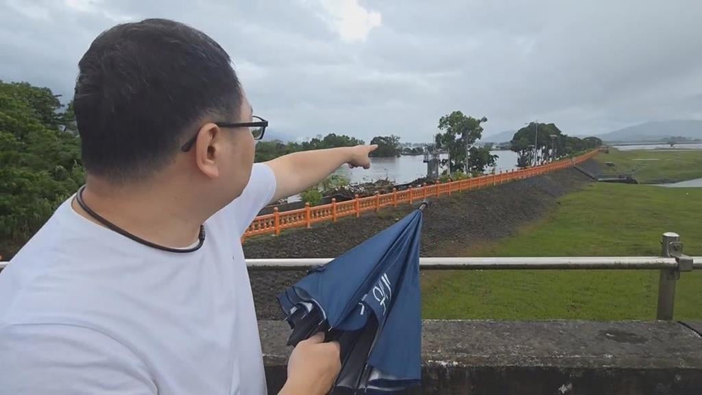 花蓮光復鄉大同村災民哽咽說,「那個水那麼深!在這裡 差點給它流走了,我差一點....我抓著那個柱子,後來就慢慢游泳過來這樣!」
