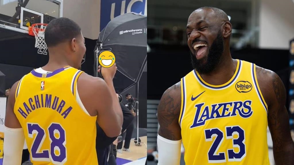 40歲的詹皇身著金黃色湖人戰袍在媒體日亮相,與大兒子布朗尼二度合體拍攝形象照,父子倆看起來少了去年的緊張與生澀,現場與攝影師的互動也自然許多,然而拍到一半,湖人日籍混血前鋒八村壘路過來插花,拿起手機偷拍詹姆斯,沒想到被發現後,詹皇直接對他的鏡頭比出「凸」的國際手勢,笑翻全場。