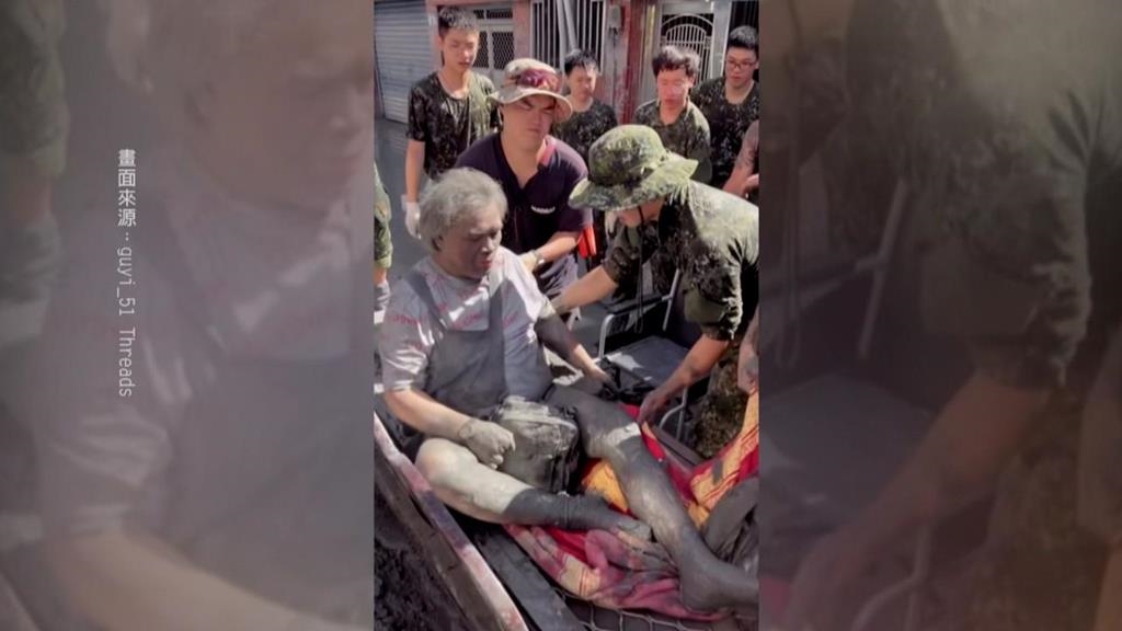 「過來過來,來小心喔!」災民,白髮阿北,滿身黑泥,躺在木板上,國軍弟兄齊心接力,將人從民宅內抬出。