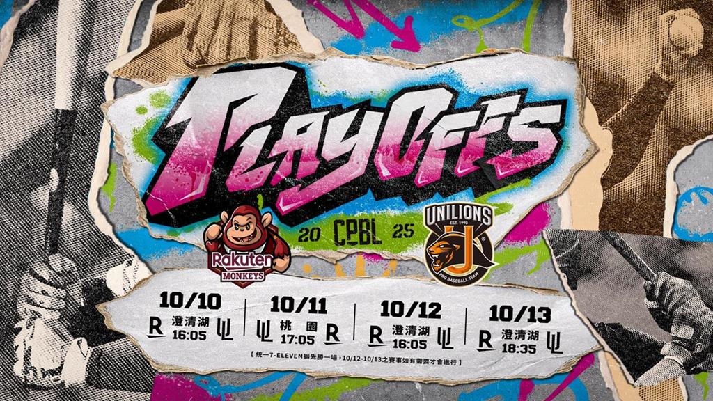 2025中華職棒季後挑戰賽對戰組合正式出爐,將由統一7-ELEVEN獅對決樂天桃猿,爭奪前進台灣大賽的最後門票,「獅猿大戰」連續三年於季後挑戰賽上演,精彩對決令人引頸期盼。今年首戰適逢國慶連假,將於10月10日在高雄澄清湖棒球場熱血開戰,究竟哪支球隊能強勢突圍,敬請拭目以待。