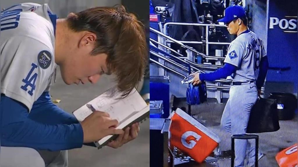 這場比賽擔任先發的山本由伸,先是被捕捉到在道奇打擊再度準備登板的時間時,手上拿著筆記本和筆不段紀錄,分析剛剛對戰的打者以及整理情蒐報告,認真的模樣讓許多人都直呼「認真的山本好帥氣」。