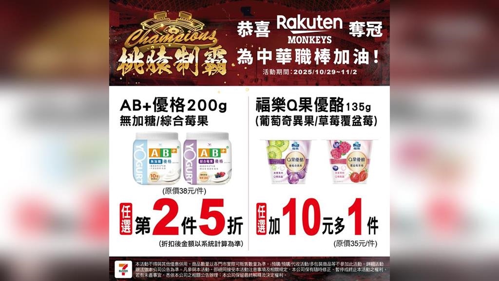 樂天桃猿勇奪2025年中職總冠軍,雖然「苦主」之一統一獅於季後挑戰賽遭到逆轉,但在樂天封王後仍於27日宣布同樣推出優惠「樂起來慶冠軍」活動,並表示「一起為中華職棒加油!慶冠軍不只樂天,7-ELEVEN與全民一同樂起來!」雖然是恭賀對手的「大氣」表現,不過也有獅迷笑著說:「身為喵迷,必須要說你這個叛徒!」