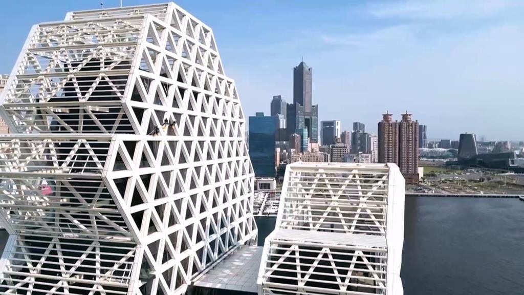 坐落在港邊的高雄流行音樂中心,好幾名作業人員吊著繩索,手裡拿著長長的工具,沿著外牆,慢慢垂降清洗。他們在幫高流建築洗澎澎,從空拍畫面看,相當壯觀,高雄流行音樂中心,這個月迎來四週年,特別安排幫建築物洗澡,每個角落都刷乾淨。