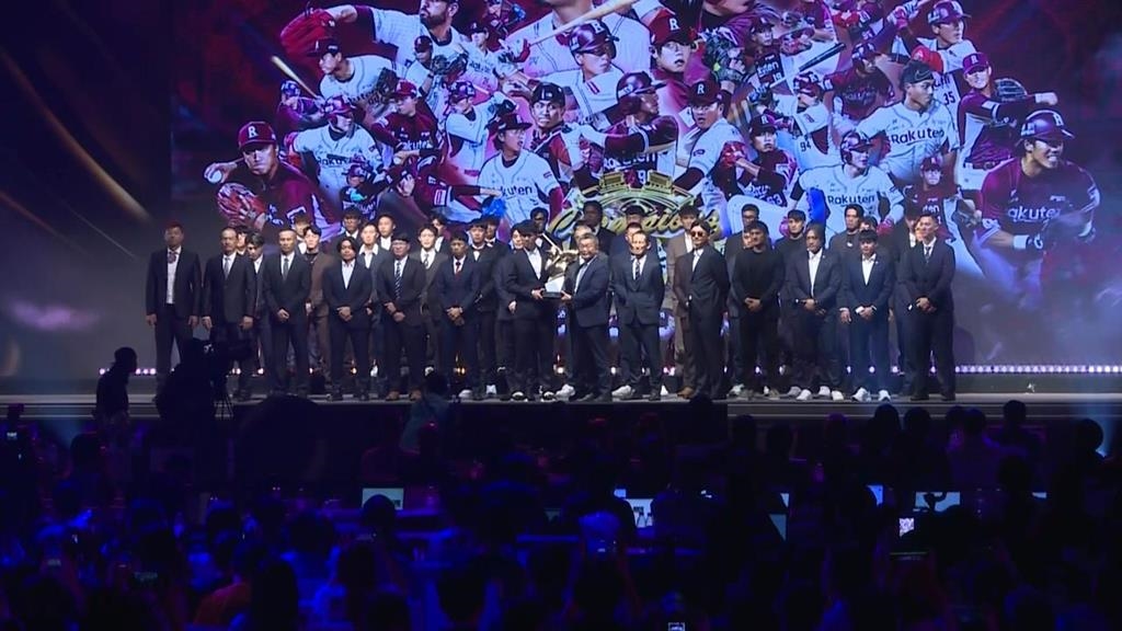 中職年度總冠軍樂天桃猿,啦啦隊活力熱舞,慶祝樂天桃猿拿下隊史第八座總冠軍球員開心大合影,中職36年年度頒獎典禮,5號晚間,睽違30年移師高雄舉辦。