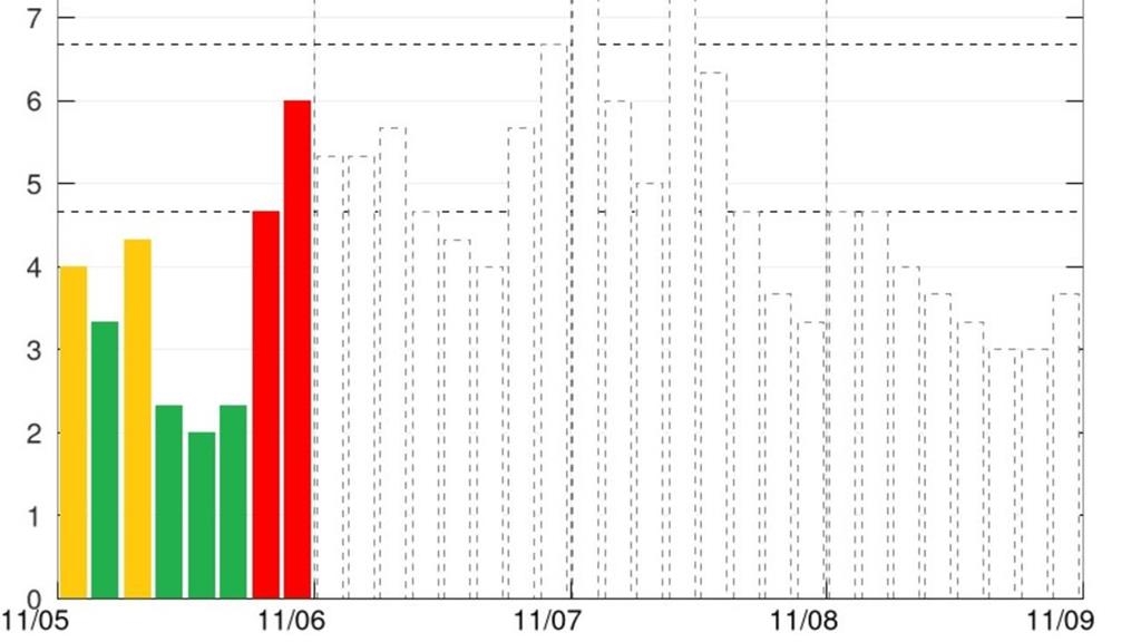 氣象署太空天氣辦公室今(6)日發布太空天氣警示,表示受到太陽表面活躍區(AR4274)於11月5日發生顯著的日冕物質拋射事件(CME),預期於11月7日清晨通過近地太空環境,造成行星際空間中的太陽風風速及密度明顯增加,依據NOAA WSA-Enlil模式資料分析,預估地磁擾動將有明顯增強並持續影響約33小時,最大規模可能短暫達到中度磁暴等級(Kp=7,G3)。