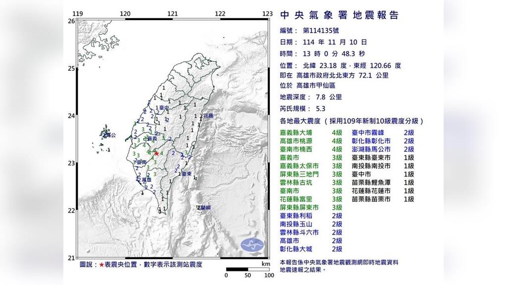 今(10)日下午1時,高雄市甲仙區發生規模5.3的有感地震,最大震度嘉義縣大埔、高雄市桃源、台南市楠西4級。