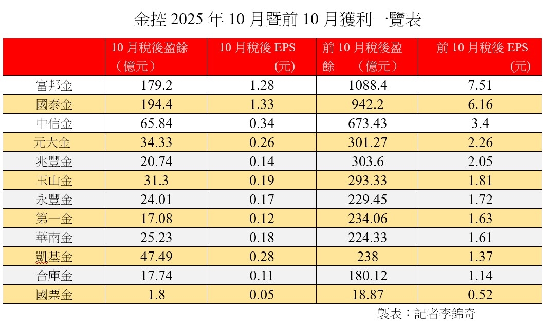 富邦金前10月EPS達7.51元居冠!國泰金6.16元居次 金控獲利一表掌握
