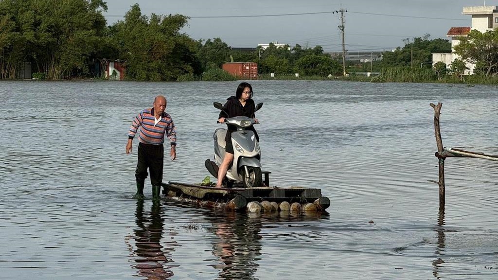 據了解,林姓鄉民平常是從事捕魚工作,划竹筏並非難事,而女兒要趕去博愛醫院上班,家中前方的淹水未退,情急之下只好連人帶車搬上竹筏,用人力加上浮力協助女兒至路面騎車。