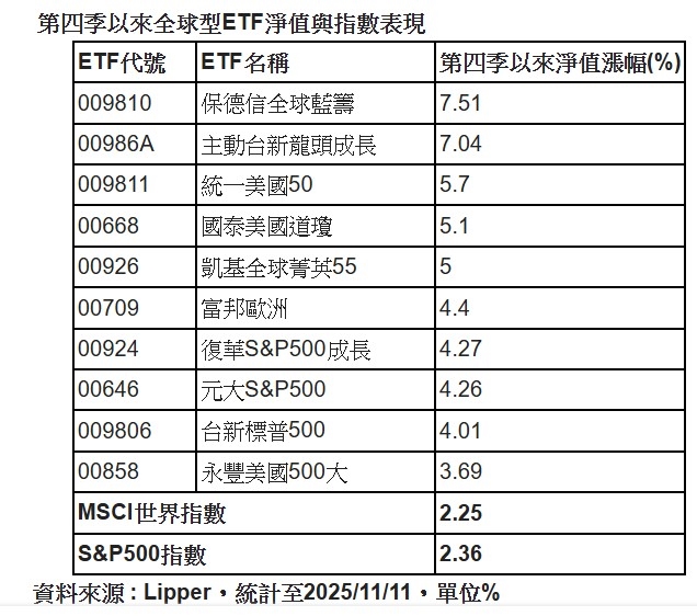 MSCI世界指數第四季以來僅上漲2.25%,S&P500指數同期漲幅2.36%,不過,法人盤點市場上相關全球或美股ETF表現,仍有不少相關ETF報酬率大幅優於指數表現,甚至最高漲幅超過7%,其中,表現最佳的是指數型全球ETF,透過指數選股機制,勝過主動型全球ETF漲勢。
