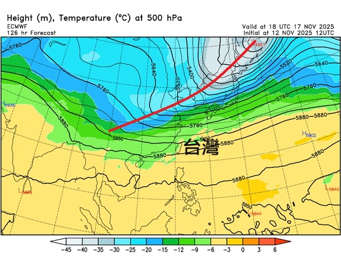 鄭明典上午在臉書貼出槽線預測圖指出,圖上顯示的槽線位置,可大致判斷地面冷空氣接近的時間,這股冷空氣預估會在 17 日晚間接觸台灣。他表示,槽線深度代表下方冷空氣勢力明顯,而氣象署的預估也顯示,各地低溫都將跌破 20 度,屬於「有感降溫」的等級。
