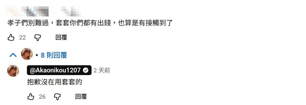 直播中,有觀眾直接問她是否單身,赤鬼伯伯當場回應:「有啊,我有男友!」並強調自己從未刻意隱瞞,「有在看我台的人都知道,我每次有人問我有沒有男友,我都說有喔~只是大家比較想相信我單身。」她還在YouTube留言區補充:「在你們腦中的劇本裡,我是單身可追的女主播,但現實不是。」更語出驚人地寫道:「(我跟男友)沒在用套套的。」