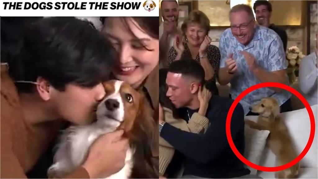 而賈吉也有兩隻「小短腿」長毛臘腸,法官今年以4票的差距擊敗勁敵全壘打王勞雷(Cal Raleigh),連續兩年在美聯奪下MVP殊榮,法官全家人大陣仗迎接,聽到獲獎當下掌聲如雷,法官第一時間先找老婆抱抱,兩隻愛犬一隻超興奮回頭猛跳、但找不到法官的抱抱,隨後直接蹭進賈吉腿上,互動與大谷有些不同。