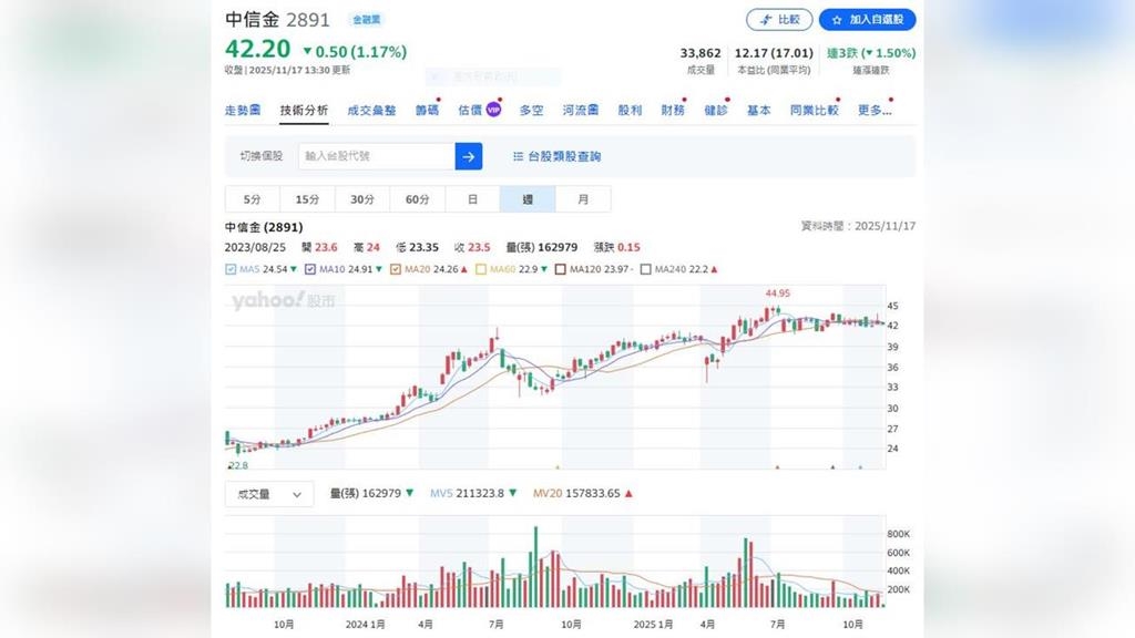 中信金控法人說明會由中信金控總經理暨發言人高麗雪及財務長暨代理發言人徐旻傾共同主持。中信金控2025年前三季累計稅後盈餘創下歷史新高,持續展現亮眼的獲利表現,稅後股東權益報酬率(ROE)領先金控同業。儘管壽險子公司台灣人壽保險公司(簡稱「台灣人壽」)受美元貶值所影響,獲利較去年同期衰退,主要子公司中國信託商業銀行表現依然強勁,續創同期歷史新高,穩居銀行業之冠。今天中信金股價下跌0.5元,收在42.2元。