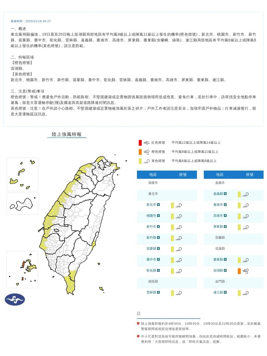 中央氣象署今日持續發布「陸上強風特報」,指出東北風偏強,至周四晚間仍可能出現 6 至 8 級以上陣風,澎湖部分地區甚至可能達 11 級強陣風。沿海地區風浪同步增強,東半部及恆春半島需留意長浪。