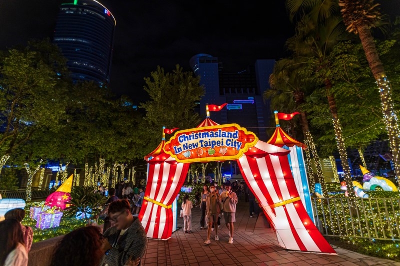 走進市民廣場的第一步,就是透過這座象徵性的「馬戲棚大門」。巨型拱門以馬戲團元素打造,熱鬧的燈飾與色彩伴隨音樂點亮夜色,像是正式宣告「歡迎來到2025新北耶誕城」。從這裡開始,整座耶誕馬戲派對正式拉開序幕,也是入城必拍的第一站。