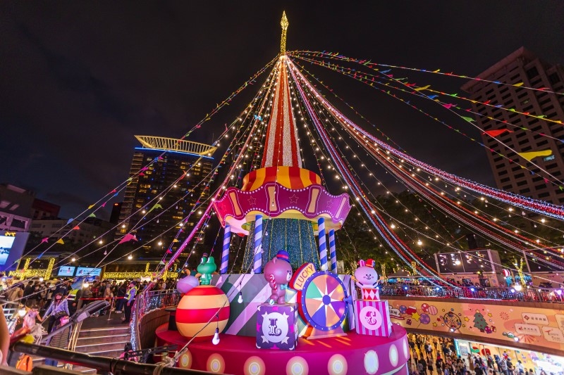 每年最受期待的主燈秀今年依然霸氣登場。整棟市府大樓成為巨型光雕舞台,透過3D投影、雷射線條、染牆燈特效全面同步演出,視覺層次比往年更震撼。整點與半點一次的展演,將LINE FRIENDS的聖誕故事完整鋪開,在多層次的光影交錯中,彷彿置身劇場中央,是整個耶誕城最不可錯過的看點。