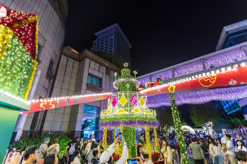 外觀像三層禮物盒堆疊的裝置,是今年最具透視感的打卡燈飾之一。高處的蝴蝶結率先點亮,視線隨著光線層層往內走,踏入禮物盒的瞬間,就像進入派對模式。展演時會以律動光影點亮整個空間,是不需排隊也能輕鬆拍出立體感照片的經典亮點。