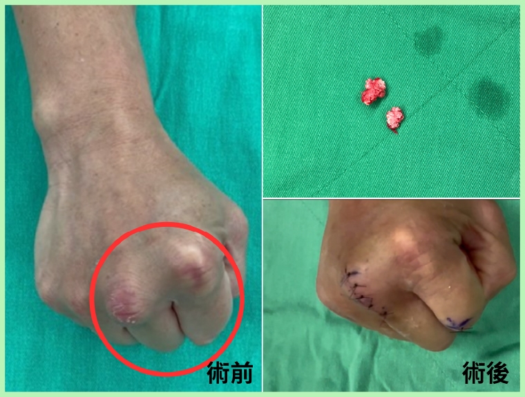 【NOW健康 楊芷晴/台中報導】56歲李先生是竹科工程師,患有痛風病史,兩年多前,他發現右手食指和中指逐漸出現痛風腫塊,不僅外觀明顯,敲鍵盤時也常感不適、抓握動作也有緊繃感,讓工作與心情大受影響。經網路搜尋後前往長安醫院就診,骨科陳冠儒醫師診斷為痛風石後,接受「微創超音波刀痛風石切除手術」,術後恢復良好,不僅擺脫礙眼硬塊,握拳、打字也輕鬆許多,讓他直呼:「早點開刀就好了!」