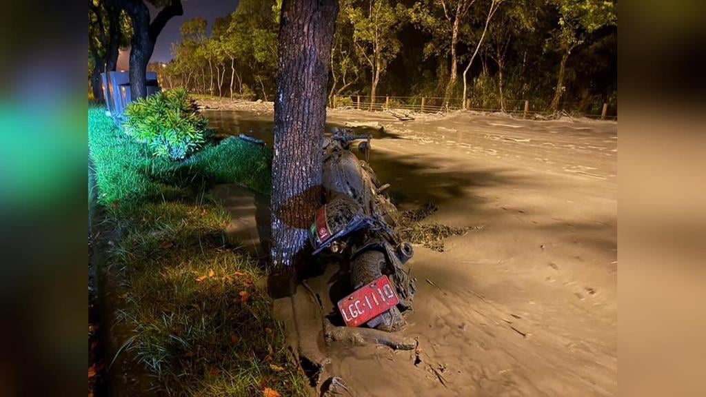 當事騎士:「我迴轉的時候,騎一小段而已,可能只有三四百公尺吧,然後就摔車,它那個泥水從看不到的地方,溢流出來,很多人看到我摔車,他們就煞車,我那時候車子被泥水漂走,連手機都被沖走了。」40多萬元的重機、滿滿照片回憶的手機,全都毀了,但慶幸的是,人只有手腳擦挫傷,沒有大礙,也還好當時有一名軍人經過,立刻停下來幫忙。