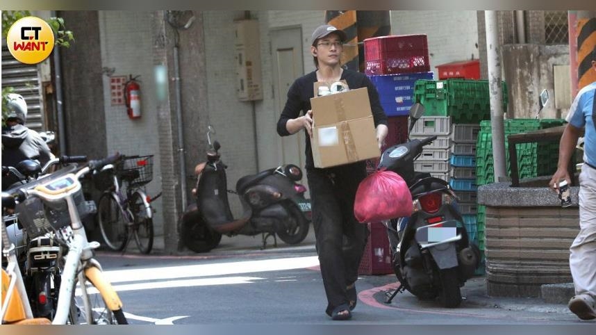 當日下午一點多,張立昂一身全黑系打扮,抱著一箱回收物、一袋垃圾,出現在自家巷口。可以看出他最近身材練得不錯,胸肌跟二頭肌把這件黑色上衣撐得十分緊繃。頭戴著棒球帽,臉上沒有半點妝容遮飾,細看他素顏狀態非常好,沒什麼瑕疵之外,甚至有點白裡透紅,無可挑剔。