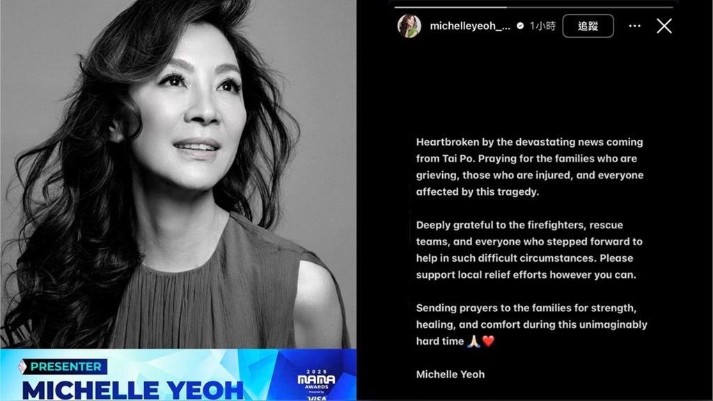 香港大埔宏福苑昨(26)日下午2時許發生嚴重火警,整排高樓陷入火海。火警造成消防員在內,至少55人死亡、超過200人失聯。今(27)日下午,奧斯卡影后楊紫瓊也在社群平台Instagram上傳了一篇黑底白字的貼文,沉痛表示心碎,「為這場悲劇的每個受害者祈禱。」