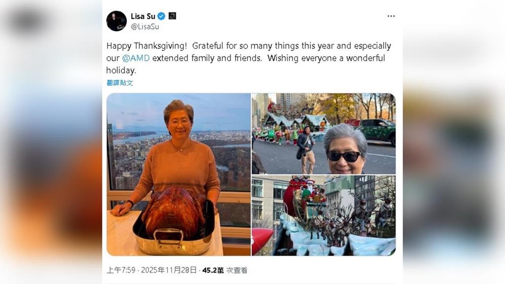 蘇姿丰連PO三張照片,包含她親手烤製的火雞佳餚,畫面令人食指大動。她在貼文中表示,「感謝今年發生的許多事,尤其是AMD大家庭與所有朋友」,祝福大家感恩節愉快。該則貼文發布後吸引超過 45萬次瀏覽,不少網友在留言區「許願」,希望她能帶領AMD市值挺進「1兆美元俱樂部」。