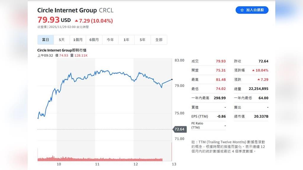 財經中心/王駿凱報導上週感恩節後,美股市場觀察顯示,穩定幣支付板塊明顯回升,成為投資人關注的焦點。Circle(CRCL)於11月28日美東盤中一度上漲約10%,顯示市場對穩定幣在企業支付與跨境結算的應用信心回升。應用層企業亦受矚目,奧丁丁(OWLS)盤中漲幅接近20%,收盤仍大漲約16%。奧丁丁近期宣布啟動1,000萬美元股票回購計畫,旨在提升資本配置效率、強化股東權益。