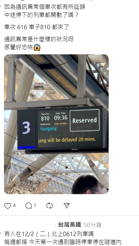 今日上午Threads有不少網友發文表示,「高鐵搭這麼多年第一次遇到延遲到站 原訂9:19到站9:38才到」、「沒聽清楚說什麼有狀況 高鐵臨時停車不知道要多久」、「此生第一次遇到高鐵誤點 說是系統問題」、「第一次遇到高鐵誤點 廣播說系統異常,在桃園已經停了快25分鐘」、「每週都搭 今天第一次遇到臨時停車停在隧道內」。