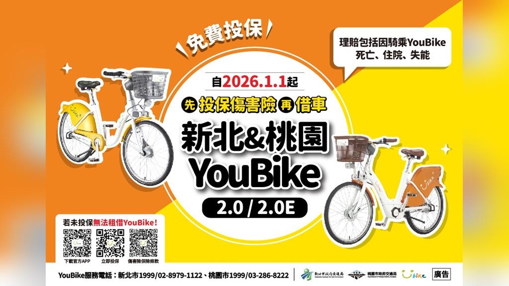 桃園市與新北市公共自行車自明(115)年1月1日起新舊會員及單次租借之臨時會員將強制投保。民眾須完成投保後,才能使用YouBike 2.0與YouBike 2.0E電輔車,確保在騎乘前即擁有基本保障,提升使用安全。