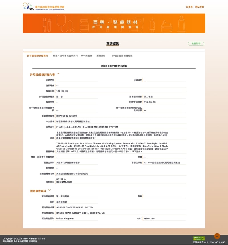 ▲國內販售亞培連續血糖監測系統(CGM)的相關醫療器材許可證。(圖/食藥署提供)