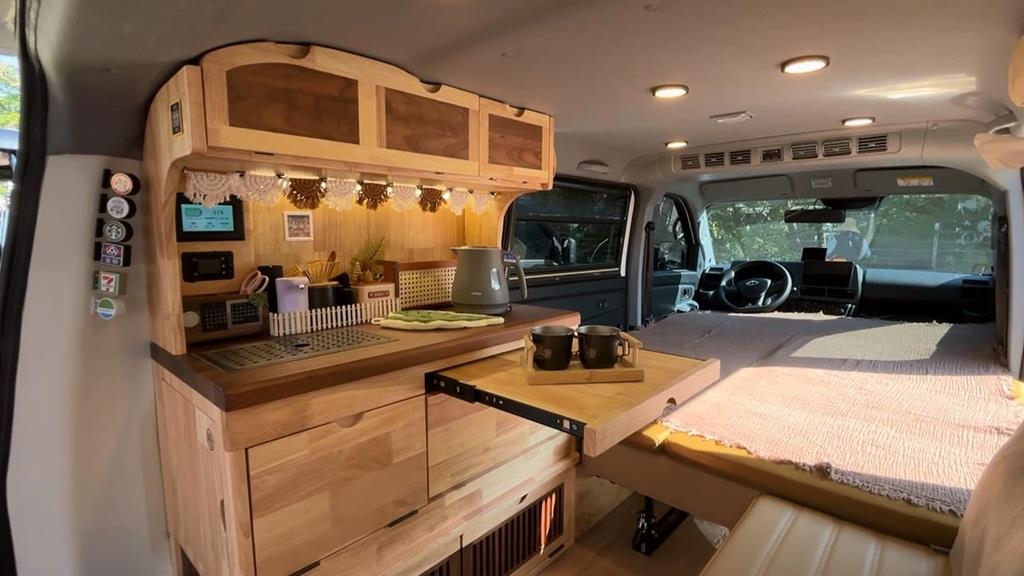 另外還有這台,滿滿粉紅泡泡,窗簾、椅墊、家具,全部都是Hello Kitty,可愛又療癒。而在隔壁這一輛,風格截然不同,走的是豹紋叢林風。露營車車主:「就是用豹紋自己用軟裝去做裝飾,這邊有一個簡單的水槽,這邊可以取水,然後可以在這邊做簡單的料理。」車內有水槽,也能簡單烹煮食物,鋪上床墊就能過夜,越來越多人喜歡車宿到處跑,活動吸引滿滿人潮。露營車廠商:「它有雙邊的流光,方便晚上下車的時候,可以看到我們的踏板伸出來。」車主依照自己的喜好設計,移動式的專屬小窩,開到哪住到哪,成為不同的出遊體驗。