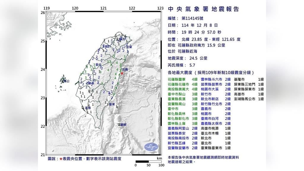 地牛翻身!今(8)日晚間7時24分左右發生規模5.7地震,震央位在花蓮縣近海,花蓮縣政府南方15.9公里處;地震深度僅24.5公里,為極淺層地震。最大震度為4級。
