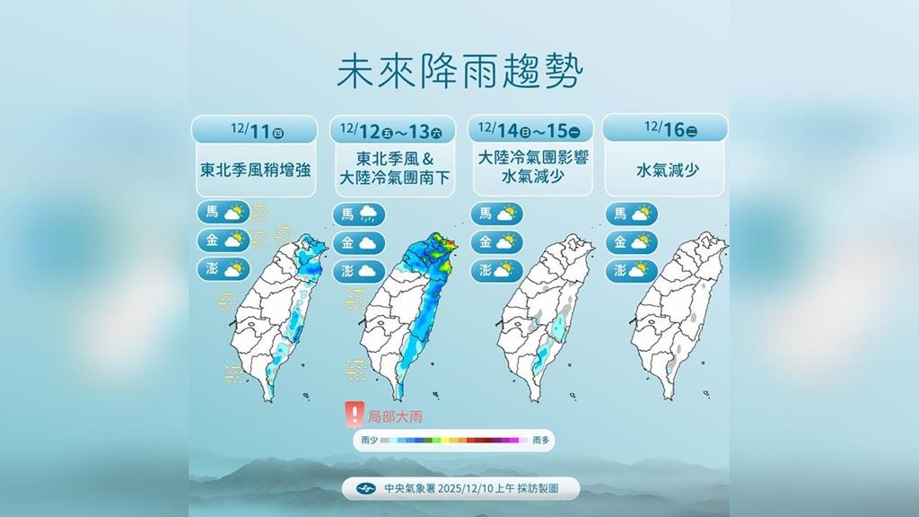 即時中心/梁博超報導由於東北季風今(11)日上午較弱,中央氣象署指出,台灣各地氣溫漸回升,全台及外島大致為多雲到晴,僅基隆北海岸、大台北山區、東半部地區及恆春半島有零星短暫雨;但下午開始東北季風稍增強,迎風面水氣增多,北部、東北部及東部地區將轉為有局部短暫雨的天氣,其他地區仍為多雲到晴。週五、週六將呈濕冷天氣型態,北部、東部低溫可能降至12至14度,中南部也僅剩13至15度。