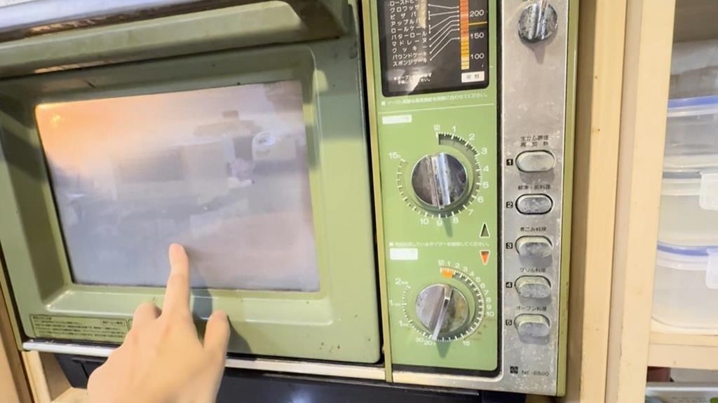 經典綠色搭配銀色外框,上頭印著日文標示,按鈕幾乎都生鏽了,看得出來歷史痕跡,這是民眾家裡的骨董微波爐,已經運轉45年。