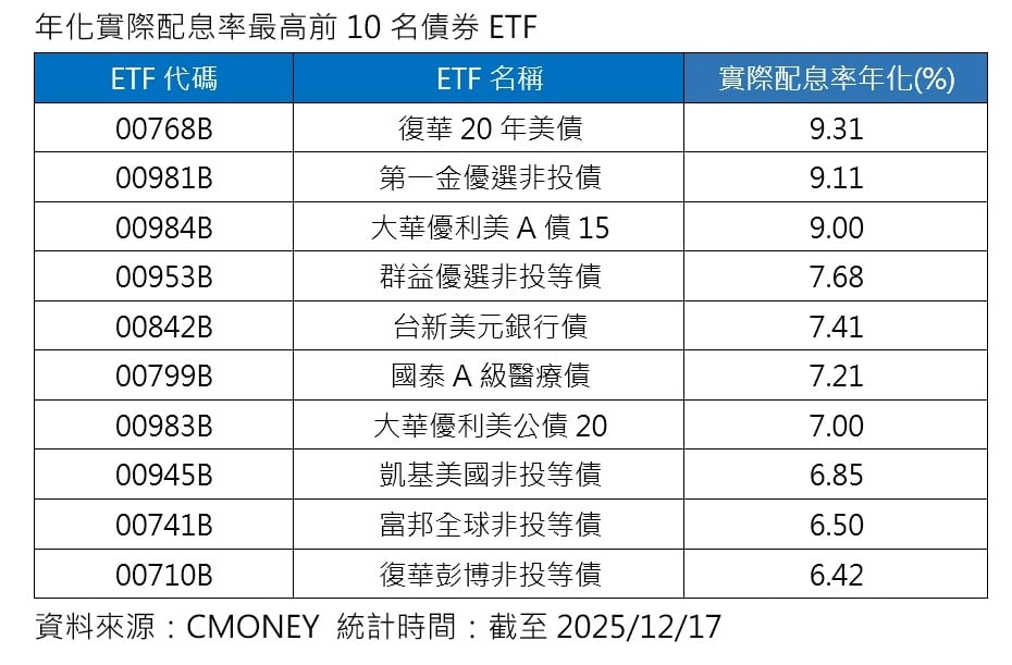 圖、文/品觀點聯準會2025年連續3度降息,更在12月宣布啟動購債計畫,政策利多加持,債券投資吸引力大增。根據CMONEY統計,截至12月17日,年化實際配息率最高前10名債券ETF,6.42%起跳,平均水準為7.65%,最高更達到9%以上。法人建議,收息族可從高配息率債券ETF中優先選擇較高信評標的,在收益與風險之間取得平衡,提升現金流的同時,也避免信用風險過度放大。