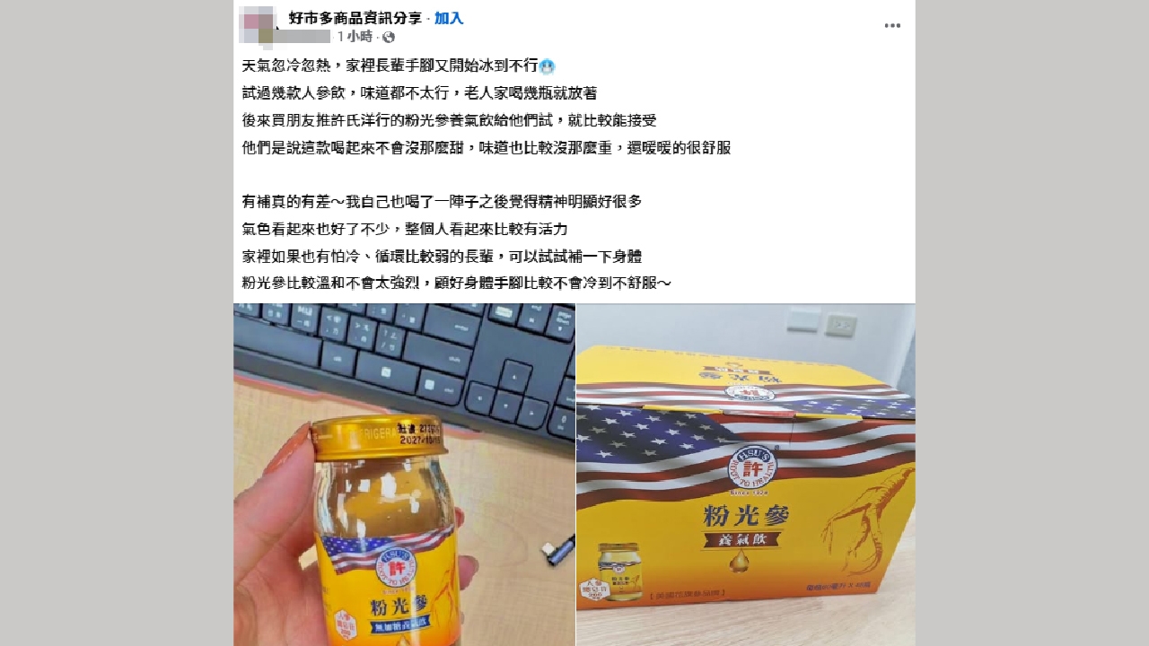 值得注意的是,原PO特別提醒,粉光參屬於溫涼性質,比較不會補到上火,但若本身有在看醫生的長輩,建議先諮詢醫師再補充。不少網友也分享自身經驗,「這個我自己有喝,每天早上喝一瓶,手腳真的比較不冷,整個人都暖暖的」、「許氏洋行我家有在喝欸,我都常常回家去偷我爸媽庫存」,可見該產品已累積不少愛用者。