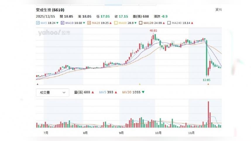 CTWANT調查,安成生技2025年11月16日夜爆NORA520(用於治療產後憂鬱症/PPD)美國二期臨床未達標,給藥組與安慰劑差異無統計顯著性,股價隔日開盤36元跳水至12.85元,跌64.31%,觸發熔斷暫停交易。這是台股生技史上罕見單日之例;至周五的收盤股價逐漸回升到16.40元。