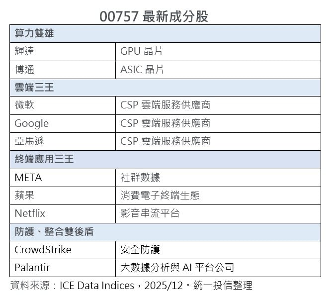 統一FANG+ ETF(00757)經理人林良一指出,FANG+指數成分股在AI各環節居主導地位,從算力與網絡基礎設施(輝達、博通)、雲端平台(微軟、Google、亞馬遜)、模型開發與終端應用(META、蘋果、 Netflix),到AI驅動的安全防護(CrowdStrike),已形成強大生態。