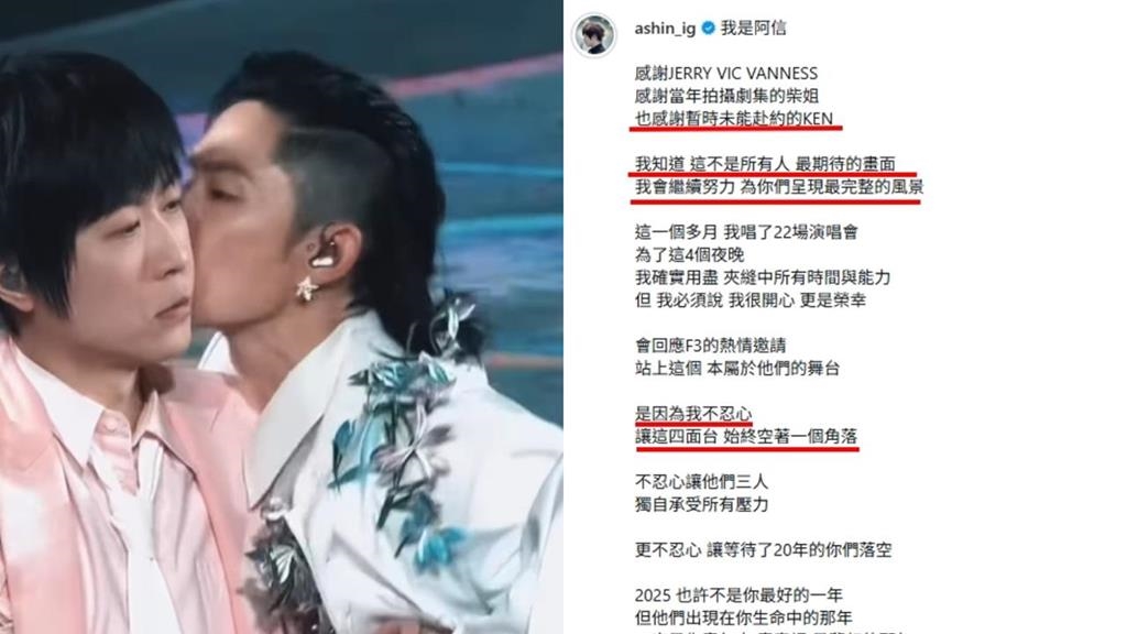 阿信在文中也對未能前來的朱孝天也表達感謝,坦言:「我知道這不是所有人最期待的畫面,我會繼續努力,為你們呈現最完整的風景。」並提到自己最近一個多月已唱了22場演唱會,為了這4晚他用盡所有時間與能力,站上本屬於F3的舞台是出於自己思考過的決定,「我不忍心讓這四面台始終空著一個角落;不忍心讓他們三人獨自承受所有壓力;更不忍心讓等待了20年的你們落空」,想把此次演出視為回饋粉絲的禮物,語氣非常溫暖。