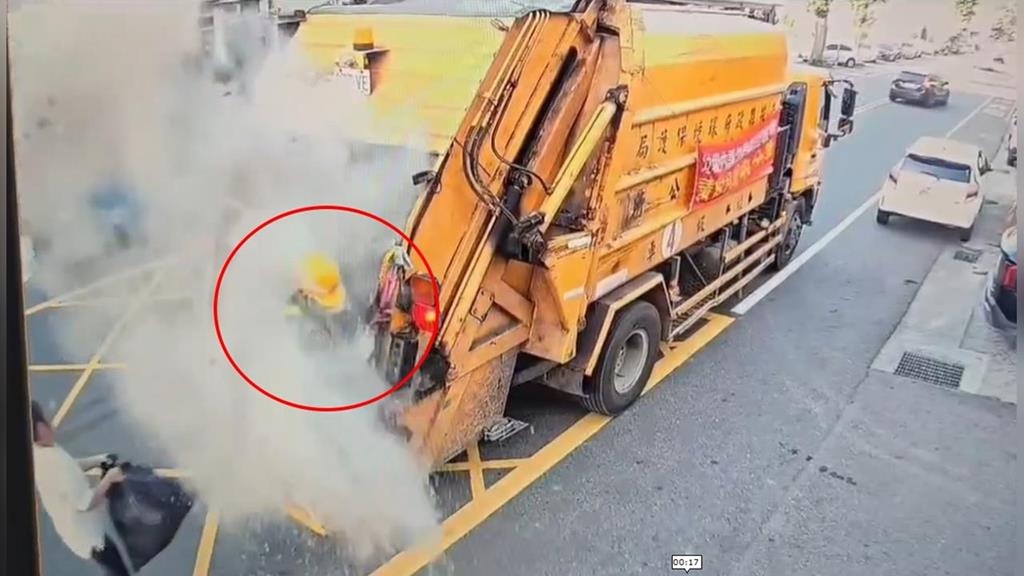 監視器畫面清楚拍下,清潔隊員站在垃圾車後方,協助民眾倒垃圾。這時一名婦人提著兩包沉甸甸黑色垃圾袋,隊員順手接過往車斗一扔,下一秒,這包垃圾瞬間炸開!再看一次,垃圾袋爆裂瞬間,揚起巨大粉塵,清潔隊員根本來不及閃,直接被灰燼吞噬變成香灰人,場面相當駭人。